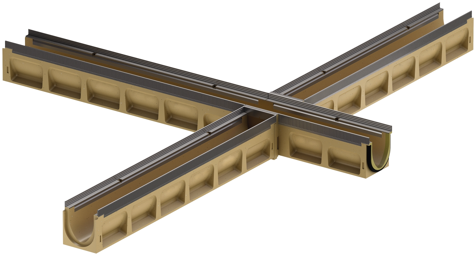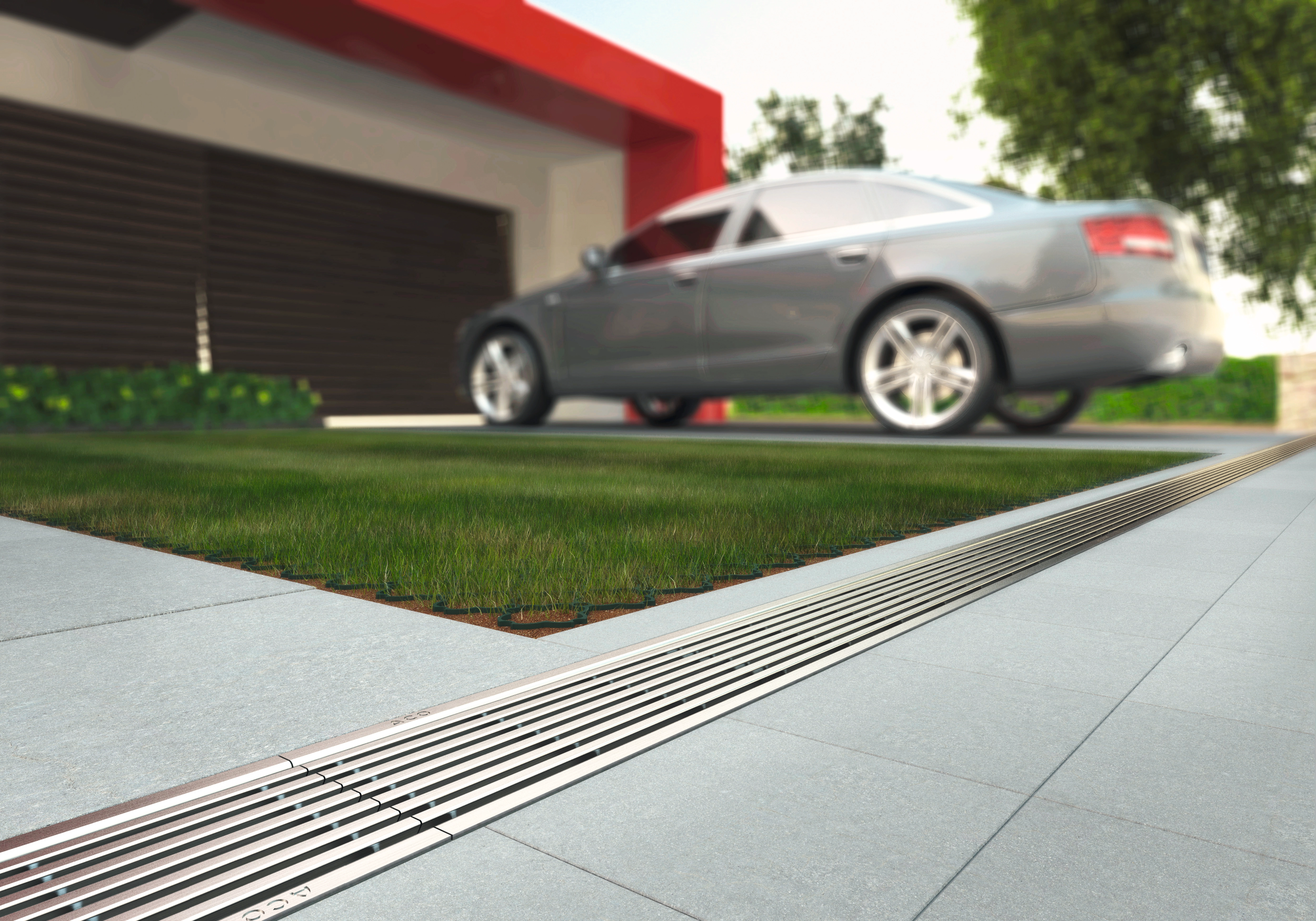 High grade polymer concrete drain channel drains with stainless steel pickled passivated (1.4301) heavy-duty gratings for loads up to D400.
